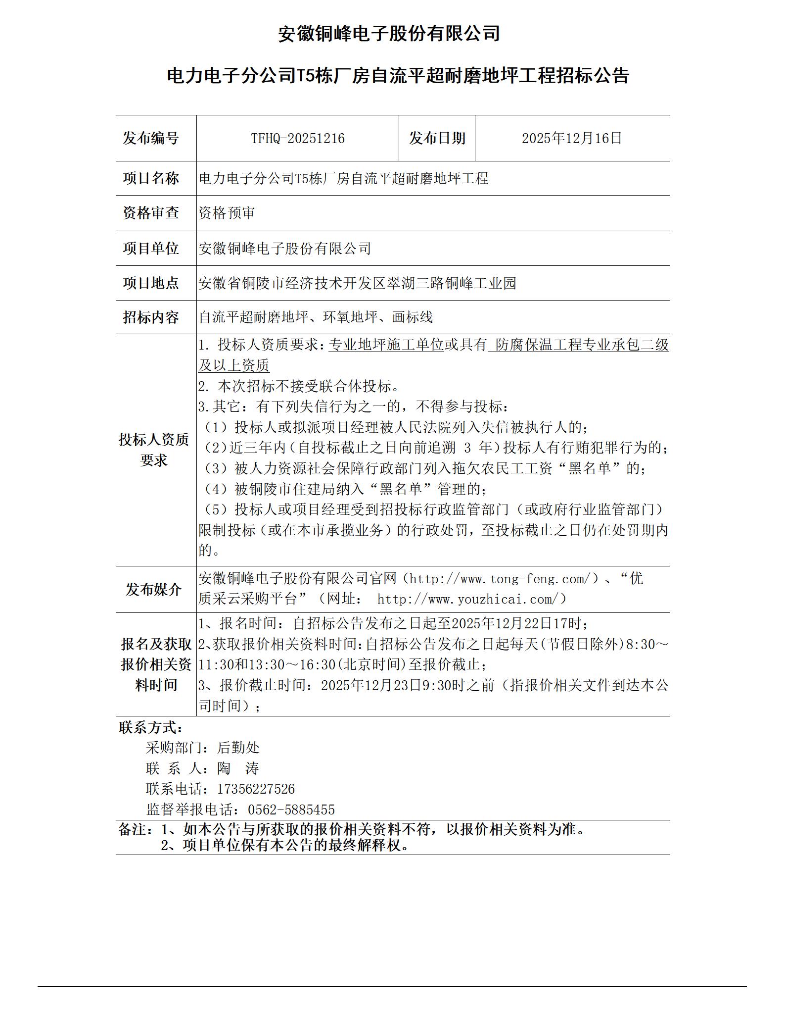 01安徽铜峰电子股份有限公司 (电力电子分公司T5栋厂房自流平超耐磨地坪工程 招标公告)_01