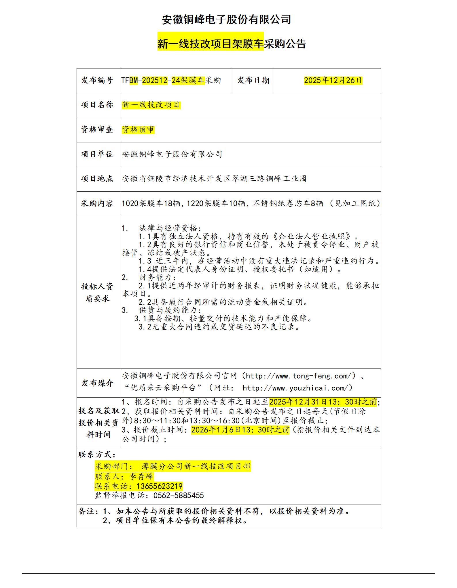 安徽铜峰电子股份有限公司 (新一线架膜车采购招标公告)_01