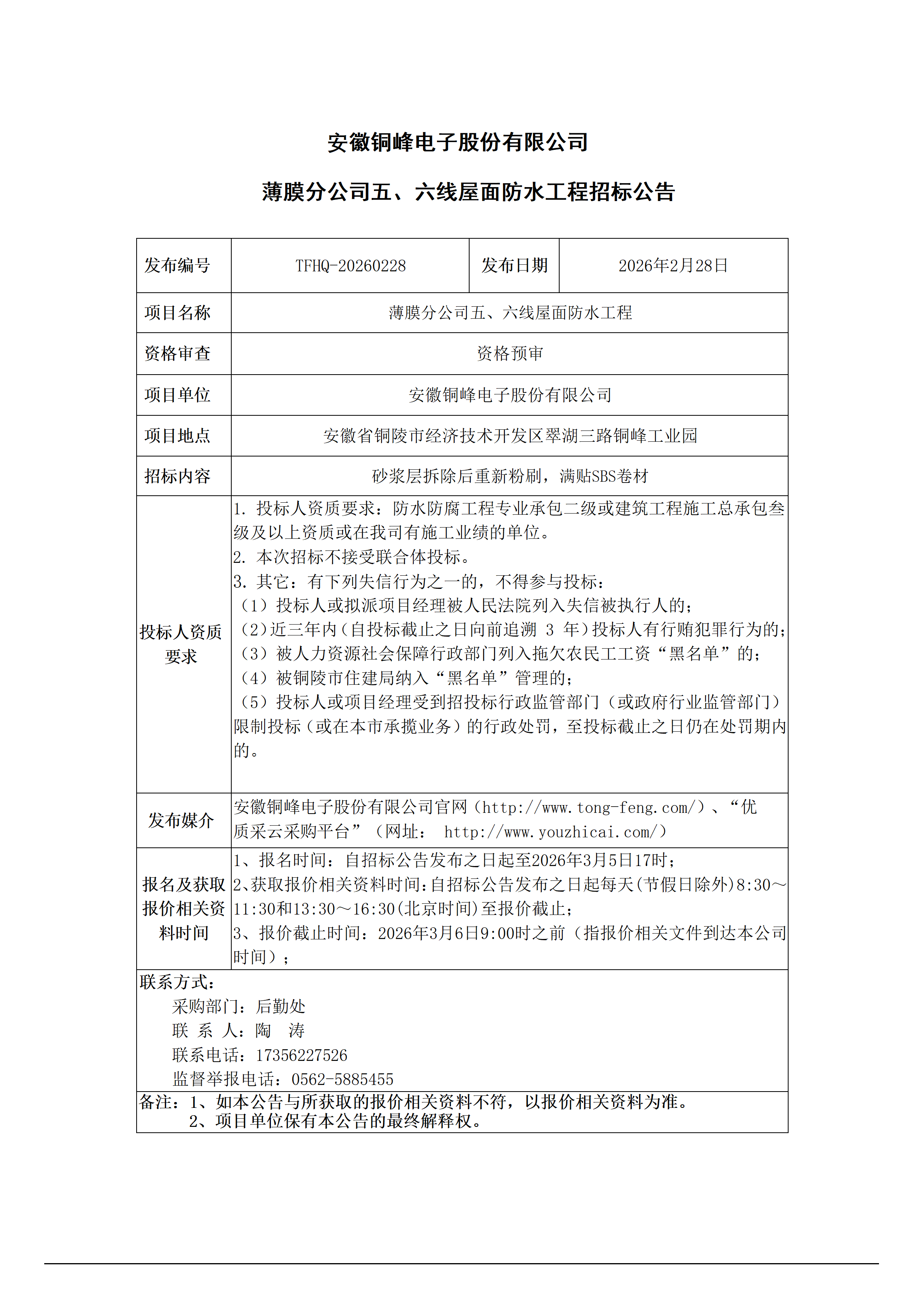 01安徽铜峰电子股份有限公司 (薄膜分公司五、六线屋面防水工程 招标公告)_01