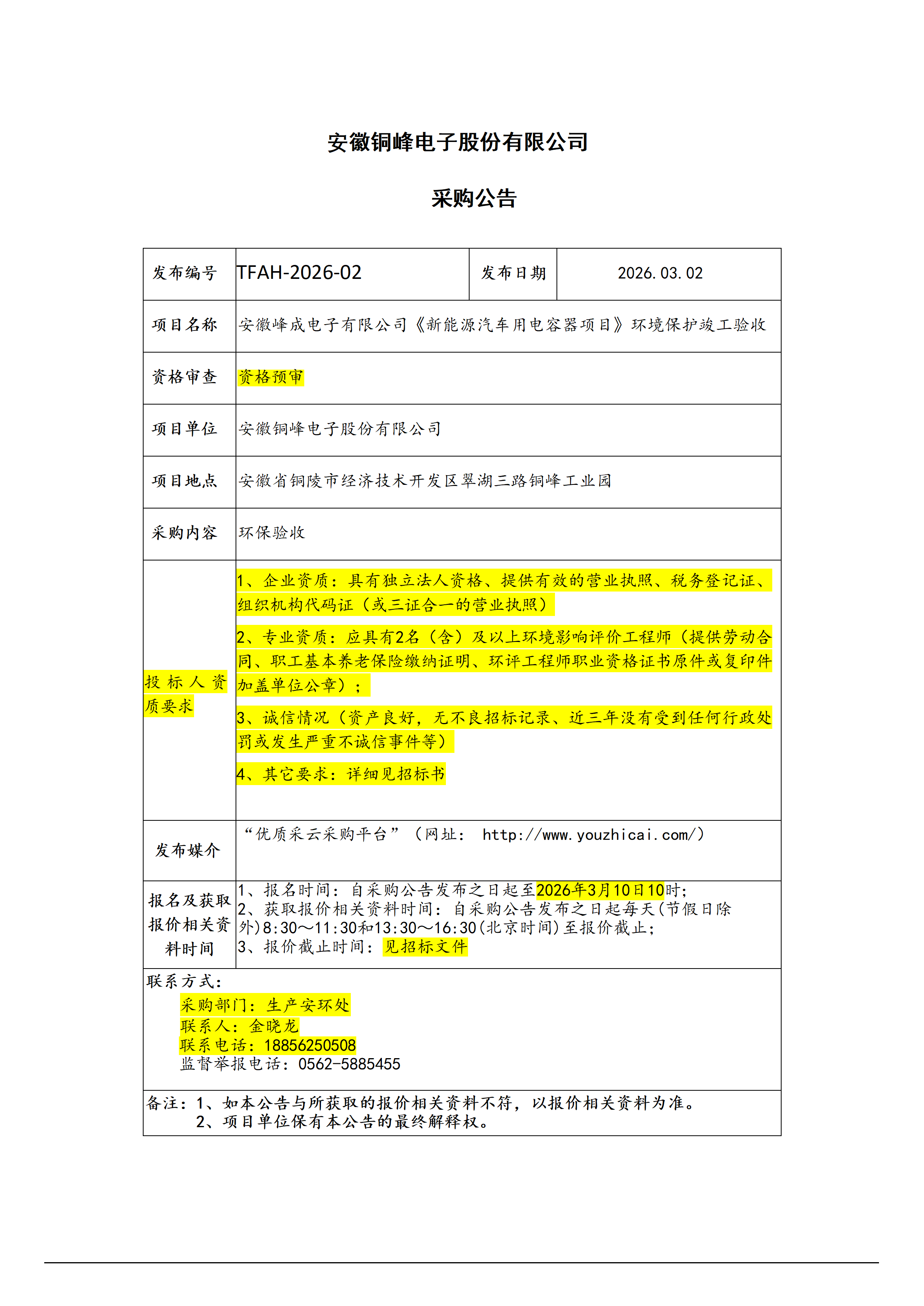 安徽铜峰电子股份有限公司 (项目环保验收招标公告 )_01